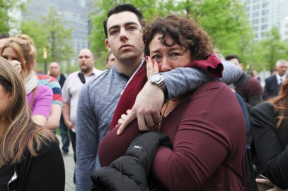 May 15, 2014, New York, New York, USA: Members of the public on the memorial plaza view the program on a television monitor during the dedication ceremony at the National September 11 Memorial Museum in New York, May 15, 2014. Allan Tannenbaum/Polaris Images/POOL