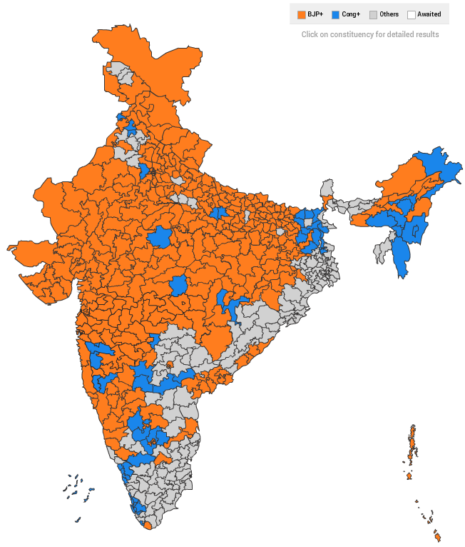 The results aren’t completely in yet [as of Friday afternoon] and BJP has already won an outright majority of 280 out of 545 seats. Typically, several parties have to form coalitions to get a majority, so the fact that BJP has a majority all on its own is a big deal.