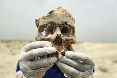 A forensic expert holds up part of a human skull found in a mass grave some 10 kilometers from the Iraqi central shrine city of Najaf on May 19, 2014. The bones of 27 people, believed to be victims of the 1991 Shaaban Revolt ,will have their DNA tested for identification purposes. The Shaaban Revolt was a series of popular rebellions in northern and southern Iraq in March and April 1991 after the Gulf War which was quashed by the regime of then president Saddam Hussein. AFP PHOTO/HAIDER HAMDANI (Photo credit should read HAIDER HAMDANI/AFP/Getty Images)