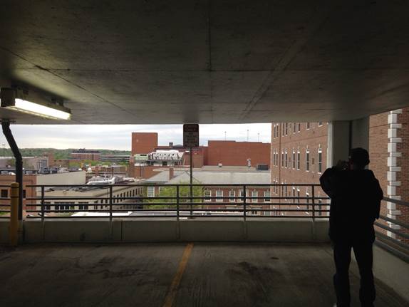 I’ve worked on this with my daughter – a past VFYW winner and multiple correct-guesser – and since I live in Ann Arbor it was easy for me to visit the adjacent parking structure to check out sight lines and architectural details. While I was checking things out this morning in the structure, a guy in a white shirt and tie approached me, and I figured it was parking management coming to find out just what in hell I was doing wandering around taking photos. It turns out he’s a fellow Dish reader and VFYW contestant who came to investigate the same location I was! I’ve attached a short video clip I shot of him: