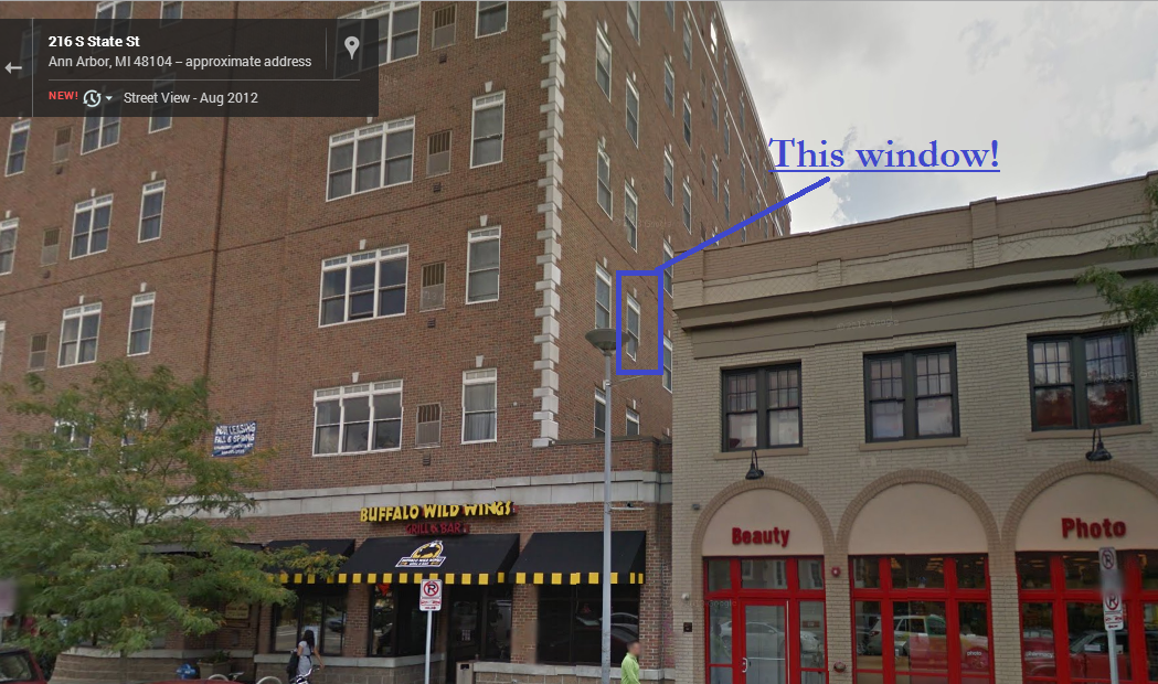 Unless this is somehow the first email you’re reading, I’m sure you’re familiar with the details already, but the street view is looking south from E Washington Street, with the apartment building on the right and 202 South Thayer on the Left. I’m going with the third story window on the SW corner of the building, since it’s got to be taller than the CVS, but not by much.