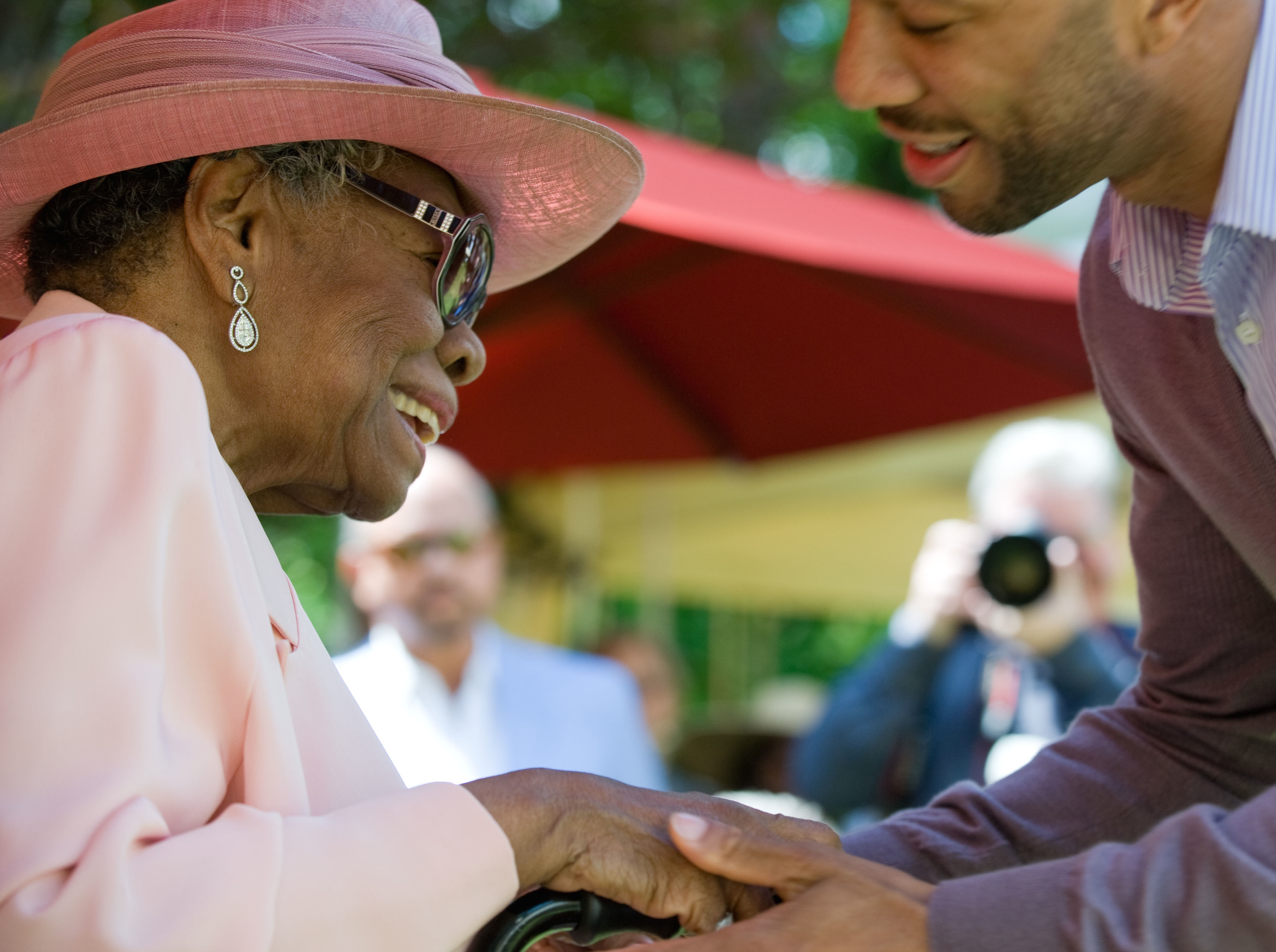 (Photo: Poet Dr. Maya Angelou and musician Common attend Angelou’s 82nd birthday party with friends and family at her home in Winston-Salem, North Carolina on May 20, 2010. By Steve Exum/Getty Images)