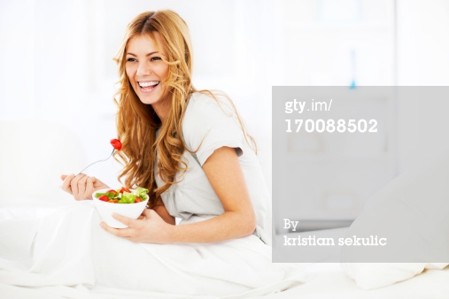 (Photo: “Smiling young girl eating salad for breakfast.” By Kristian Sekulic/Vetta. More such images can be seen on this classic tumblr. Update from a reader: “How can you mention ‘Women Laughing Alone With Salad’ without also mentioning ‘Women Struggling to Drink Water‘?…”)