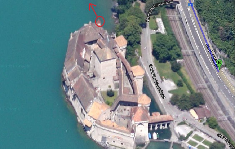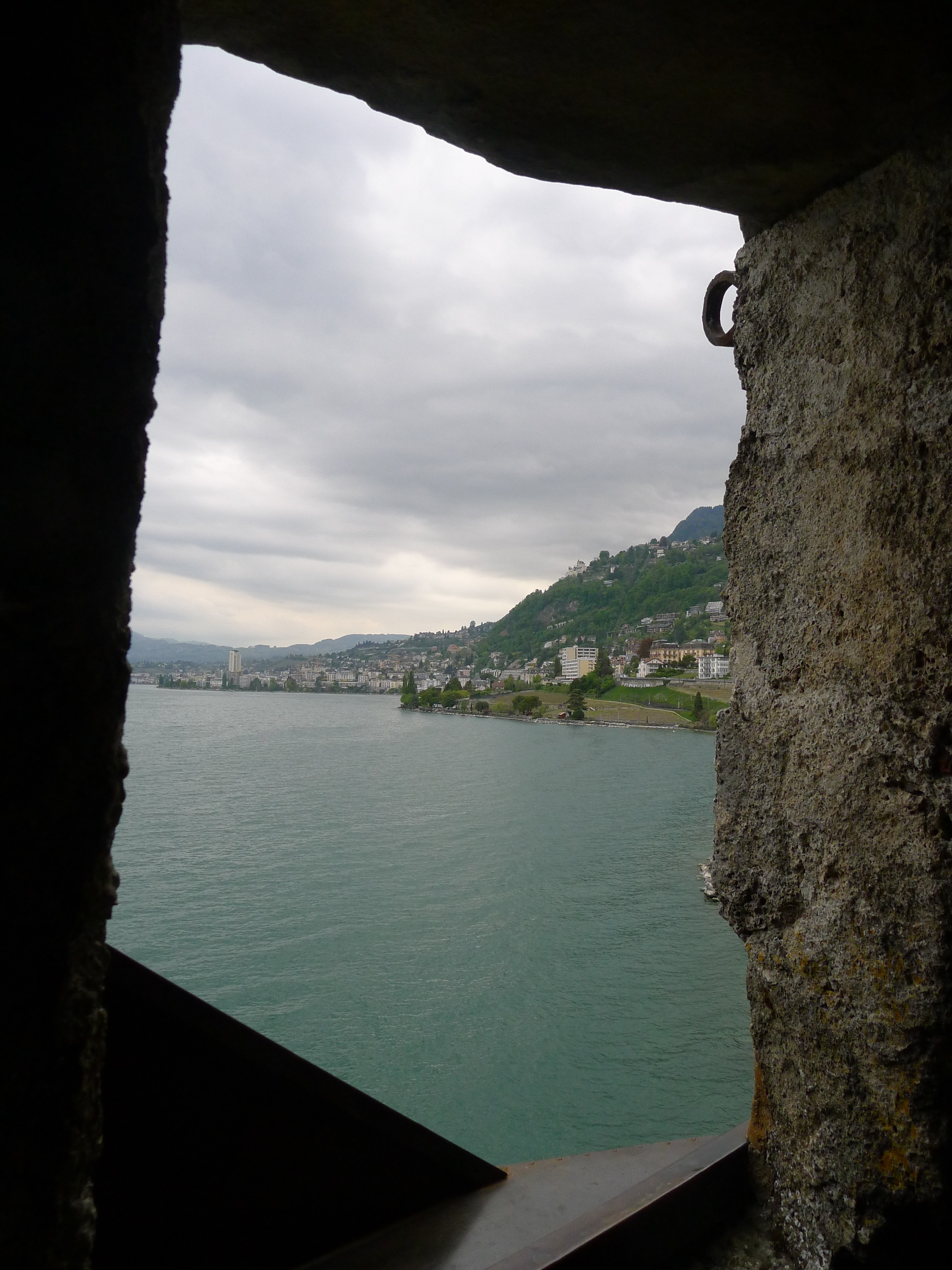 My wife and I were there in April and she took a photo from the same window. The window is indicated by an arrow in the attached photo. Chillon Castle dates from the 12th Century. It was built to control movement between the north and south of Europe through the upper Rhone valley. The prison in a lower level of the castle was made famous by Lord Byron in his poem “The Prisonier of Chillon”. Byron left his mark on a pilar in the prison.