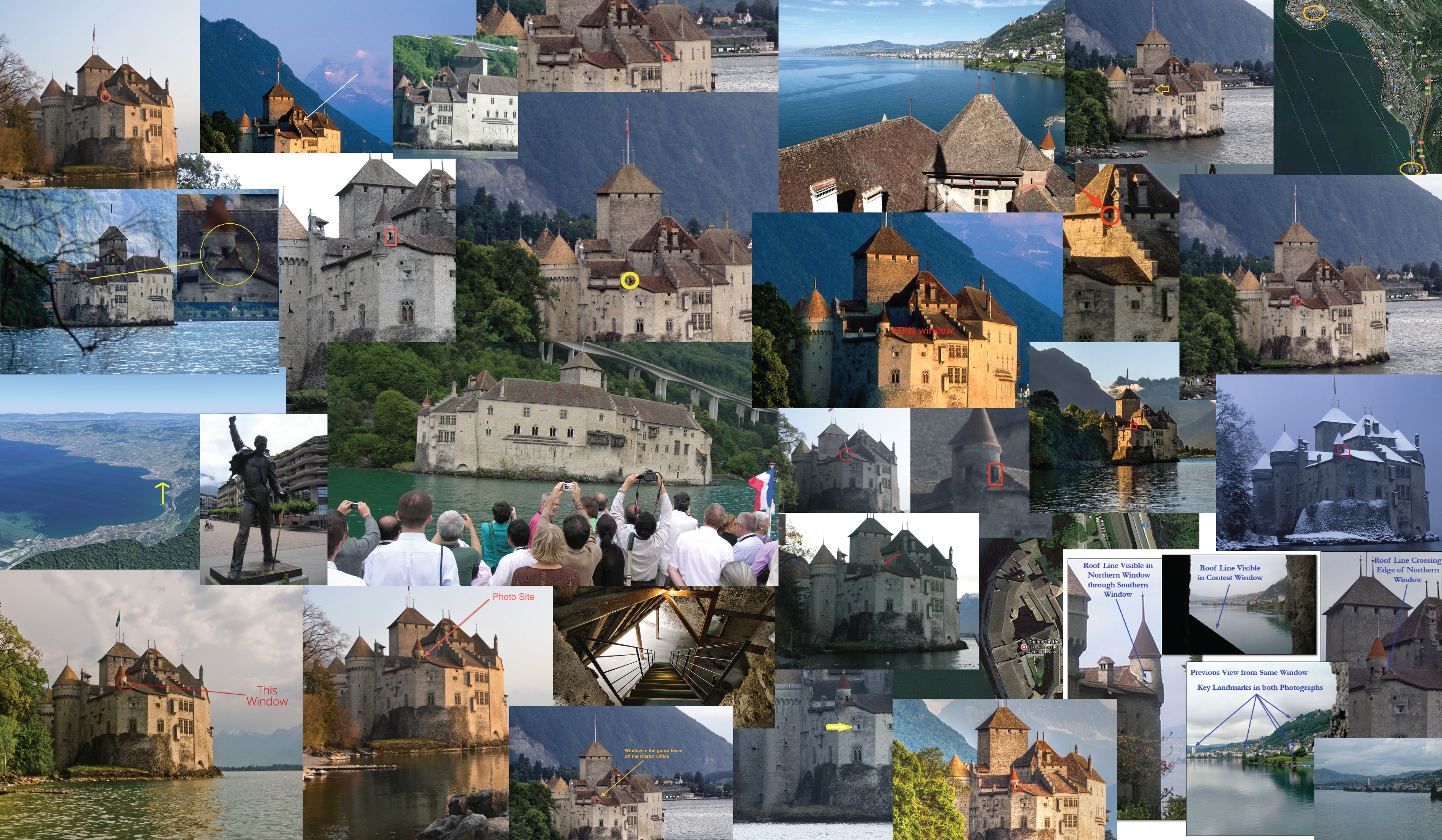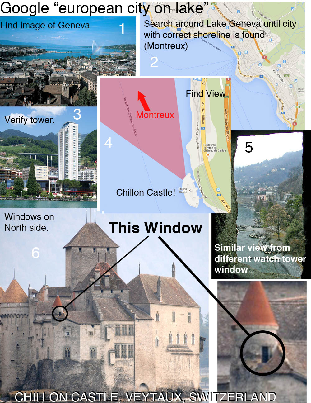 Moving on to Plan B, Lake Geneva, we quickly found the Château de Chillon, and from there the nearby city of Montreux which has a white high-rise structure matching the one that features prominently in the contest photo. Locating the below photograph taken from the Château de Chillon which is nearly identical to the contest photo clinched our choice.