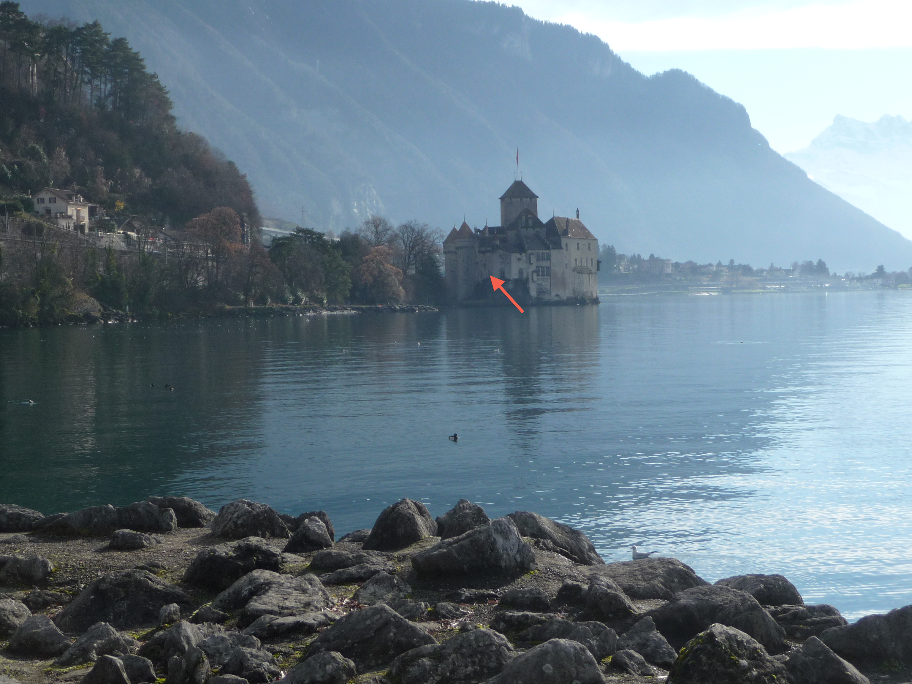 Our guess is that the contest photograph was taken from the Château de Chillon, a castle in Veytaux, Switzerland. The castle is located on a small island in Lake Geneva, and its address is listed on its website as Avenue de Chillon 21, CH – 1820 Veytaux. (Yes, these days even medieval castles have websites.) The photograph was taken facing north-northwest. We are guessing it was shot from the turret window circled in the photograph below: