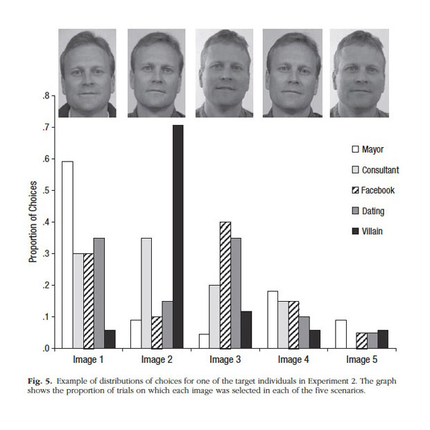 In … one of the study’s experiments, subjects were told they were choosing a photo to be used on a résumé for a high-salary position, a dating website, Facebook, a mayoral campaign poster, or a headshot for the role of a villain in a film. They were then given five photos of the same individual and asked which one would be best for the task at hand. … Look at Image 2 and Image 4. They’re almost identical, and yet just about everyone saw the former and said, “Yep, villain,” while hardly anyone said that of the latter.