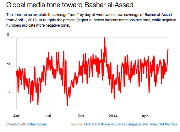 A review of news coverage from this time period reveals a world anticipating U.S. military action in the first few days after Ghouta, with substantial reference to President Barack Obama’s “red line” policy towards chemical weapons. But as the Obama administration wavered, and it became increasingly clear that not even a symbolic missile strike would occur, the discourse around Assad began to change dramatically — from a vanquished has-been in his last days, to a resurrected and invulnerable leader. … Of course, the world’s media wasn’t applauding Assad for gassing children to death, but it’s clear that, as a group, it contextualized the lack of response to those horrific actions as an indicator of new-found impunity.