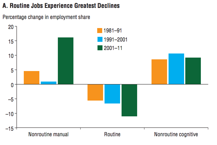 While jobs fall out of the middle, new jobs are created at the top and bottom. And those jobs at the bottom tend to be “nonroutine manual” jobs: those that require few skills and little problem-solving. Many of these errand jobs fit this bill perfectly, involving deliveries and other rote tasks. These new errand jobs can feature high pay — Instacart, Manjoo noted, can pay $30 an hour. But a major problem is finding steady work — no grocery run takes eight hours.