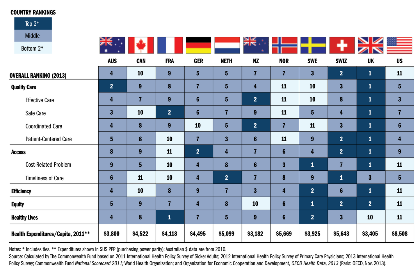 It’s important to note that one reason for America’s lag, as the authors explain, is our historic absence of universal health coverage. But the data for the report was collected before the full implementation of Obamacare, which dramatically expanded health insurance, so it’s possible that the U.S. may rise in future rankings. And notably, both the U.K. and U.S. ranked low on the “Healthy lives” scale, which considers infant mortality, healthy life expectancy at age 60, and mortality from preventable conditions, such as high blood pressure.