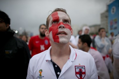 RIO DE JANEIRO, BRAZIL – JUNE 19: England fans look on as Uruguay scores their first goal against England as seen on the screen set up at Word Cup FIFA Fan Fest on Copacabana beach June 19, 2014 in Rio de Janeiro, Brazil. (Photo by Joe Raedle/Getty Images)