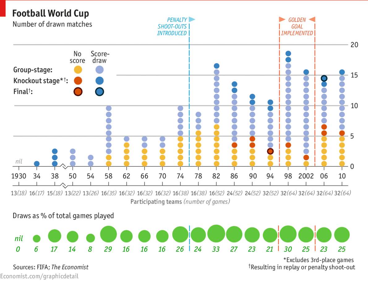 Monday’s 0-0 match between Iran and Nigeria was the first draw of the ongoing World Cup. As the above chart from The Economist illustrates, that’s pretty unusual: