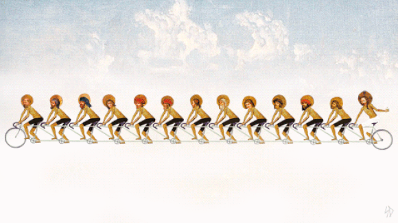 A: Most of my ideas come from things that I see getting played out day to day in my life. The other day I was looking at the water cooler at the office where I work part-time, and I thought, What would it be like to have a water cooler in in the Vatican? Or in the paintings at the Vatican? So I made a GIF about that.
