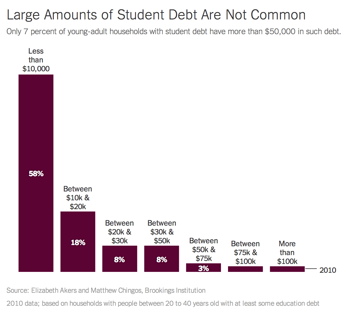 In fact, the share of income that young adults are devoting to loan repayment has remained fairly steady over the last two decades, according to data the Brookings Institutions is releasing on Tuesday. Only 7 percent of young-adult households with education debt have $50,000 or more of it. By contrast, 58 percent of such households have less than $10,000 in debt, and an additional 18 percent have between $10,000 and $20,000. “We are certainly not arguing that the state of the American economy and the higher education system is just great,” Matthew Chingos, a Brookings fellow and one of the authors of the new analysis, told me. “But we do think that the data undermine the prevailing sky-is-falling-type narrative around student debt.”