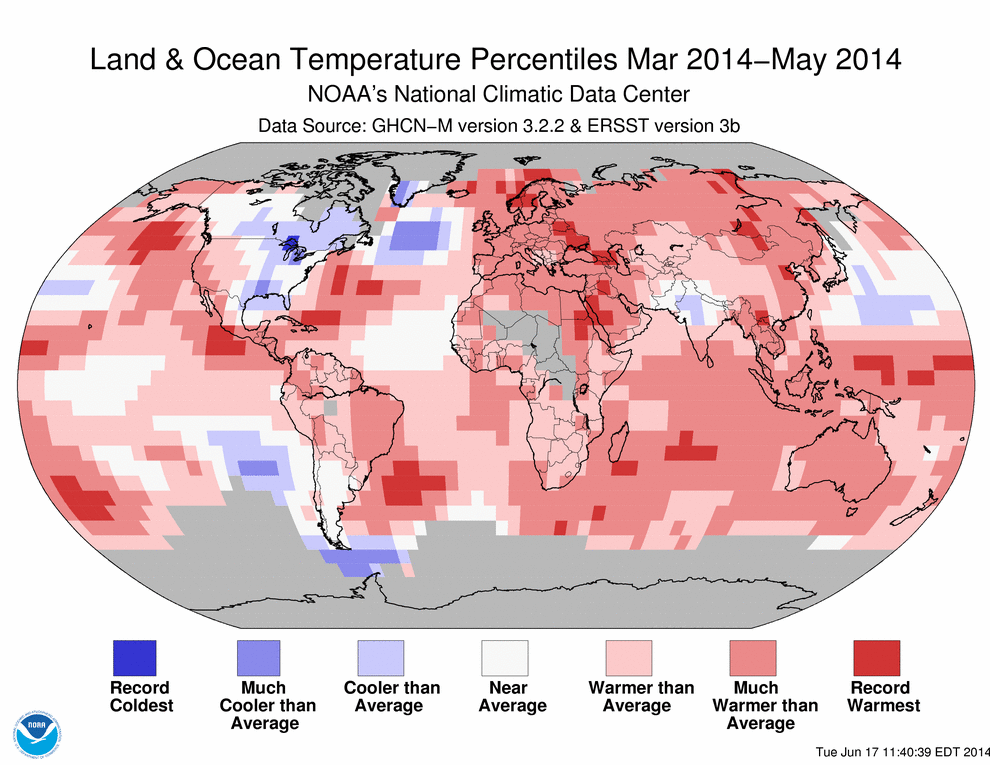 Temperatures have indeed been much hotter than average in the Middle East this year. According to the US National Oceanic and Atmospheric Administration, just about the entire region was classified as “Much Warmer Than Average” for the March-May period, while much of Iraq and bits of Syria saw record-high temperatures.
