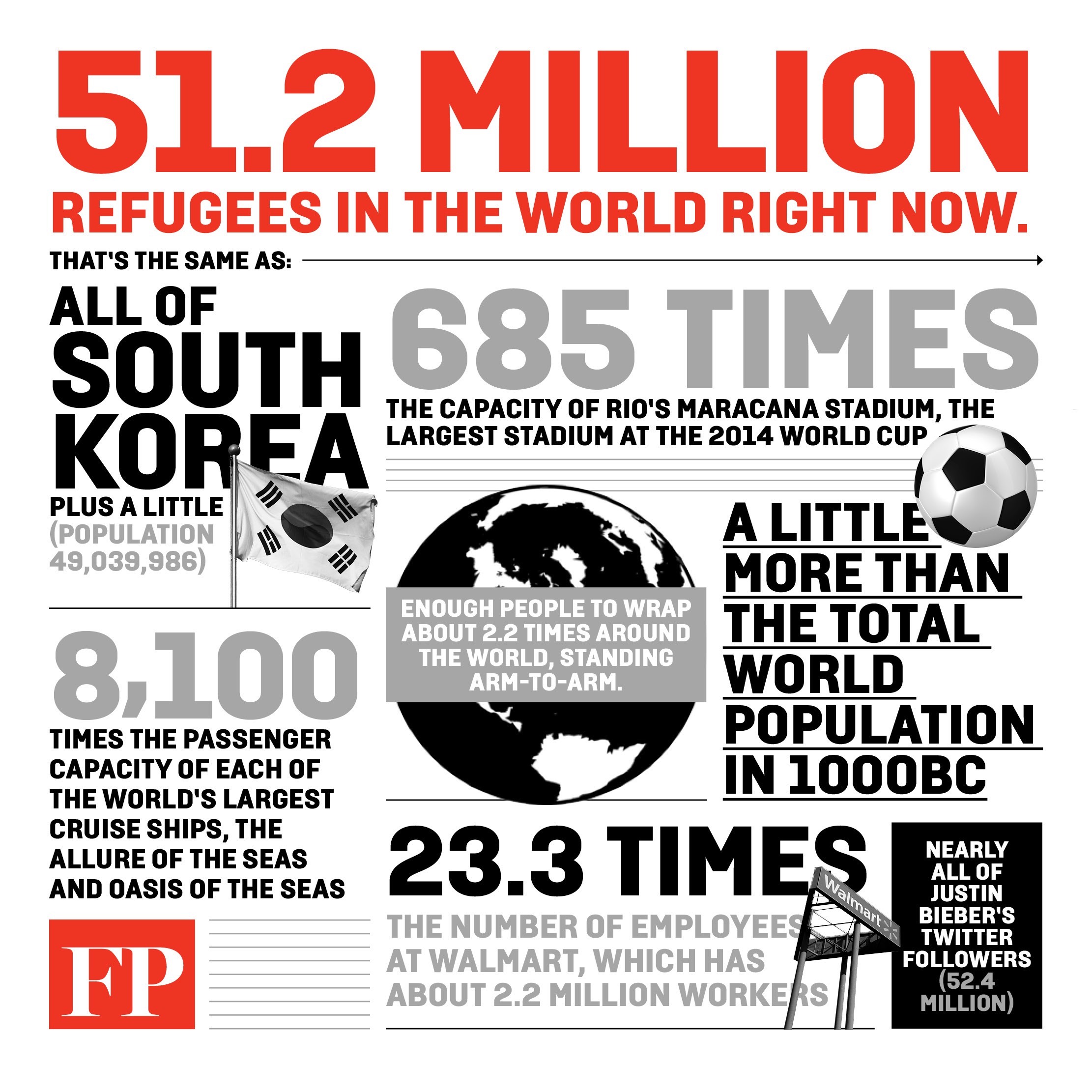The sharp increase in the total number of refugees was in large part the result of the ongoing Syrian civil war, which has forced 2.5 million to flee the country and resulted in 6.5 million internally displaced people. In total, there were some 51.2 million refugees in the world at the end of 2013, an increase of more than six million on the previous year. On its own, the figure 51.2 million can be somewhat difficult to conceptualize, a figure so large that it’s difficult to imagine the human toll of conflict.