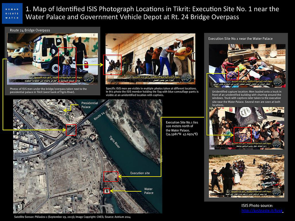 Human Rights Watch determined that the photographs were taken a stone’s throw from the Tigris River and a former Hussein palace. The group’s analysis picks out individual captives and militants who appear across the photographs, seemingly bolstering the photos’ authenticity. The analysis suggests that between 160 and 190 men were killed between June 11 and June 14, though the actual death toll from ISIS executions in Tikrit could be significantly higher. The slides documenting the analysis are reproduced at the bottom of this post.
