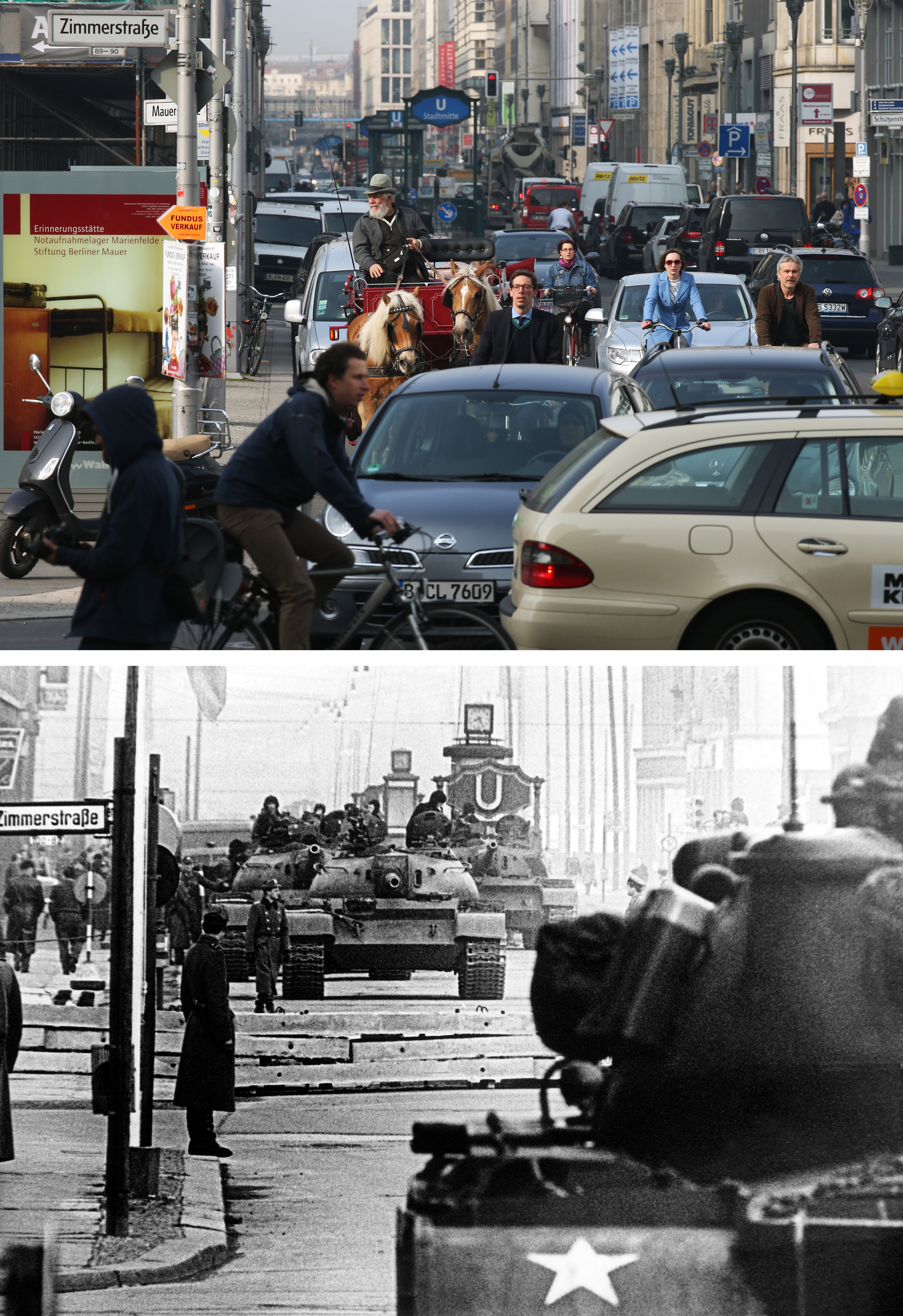 (Photos: 1) Roses stuck in a gap of the memorial of the Berlin Wall on November 9, 2013 on occasion of the 24th anniversary of the fall of the Wall. By Stephanie Pilick/AFP/Getty Images. 2)In the first composite image, a comparison has been made between Berlin in the 1960s and Berlin now in 2014. In the color photo above traffic, cyclists and a horse-drawn carriage carrying tourists make their way across the intersection of Friedrichstrasse and Zimmerstrasse at former Checkpoint Charlie on April 1, 2014 in Berlin, Germany. In the black and white photo Soviet tanks (behind) and U.S. tanks confront one another at the same location on October 26, 1961. By Keystone-France/Gamma-Keystone via Getty Images. 3) In the second composite image, the color photo shows a man walking a dog past the memorial to the Church of Reconciliation, which was demolished by East Berlin authorities to make way for a widening of the Berlin Wall, in Bernauer Strasse on February 25, 2014 in Berlin, Germany. In the black and white photo people in West Berlin look at an early version of the Berlin Wall in front of the church at the same location sometime in 1961 or 1962. By Imagno/Hulton Archive via Getty Images.)