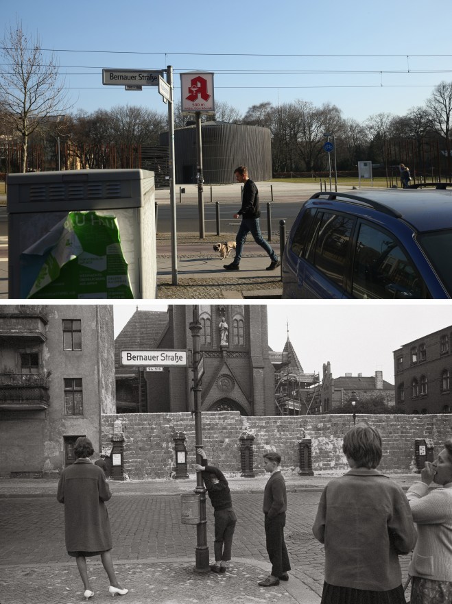 (FILE PHOTO) In this composite image a comparison has been made between Berlin in the 1960s (BOTTOM) and Berlin now in 2014. ***TOP IMAGE*** BERLIN, GERMANY – FEBRUARY 25: In the colour photo above a man walks a dog past the memorial to the Church of Reconciliation, which was demolished by East Berlin authorities to make way for a widening of the Berlin Wall, in Bernauer Strasse on February 25, 2014 in Berlin, Germany. In the black and white photo people in West Berlin look at an early version of the Berlin Wall in front of the church at the same location sometime in 1961 or 1962. (Photo by Imagno/Hulton Archive via Getty Images) The city of Berlin will commemorate the 25th anniversary of the fall of the Berlin Wall this year. The Wall, built by the communist authorities of East Berlin, divided the city between 1961 and 1989 and became the iconic symbol on the Cold War. East Germany was under communist and Soviet control from its founding as the German Democratic Republic (DDR) in 1949 and ceased to exist following German reunification in 1990. (Photo by Sean Gallup/Getty Images) ***BOTTOM IMAGE*** GERMANY – JANUARY 01: People at the Berlin Wall in front of the church of reconciliation. Photopgrahy. Germany. 1961/62. (Photo by Imagno/Getty Images) [Westberliner vor der Berliner Mauer bei der Versoehnungskirche in der Bernauer Strasse. Photographie. Deutschland. 1961/62.]