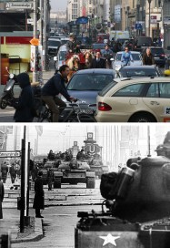 (FILE PHOTO) In this composite image a comparison has been made between Berlin in the 1960s (BOTTOM) and Berlin now in 2014. ***TOP IMAGE*** BERLIN, GERMANY – APRIL 1: In the colour photo above traffic, cyclists and a horse-drawn carriage carrying tourists make their way across the intersection of Friedrichstrasse and Zimmerstrasse at former Checkpoint Charlie on April 1, 2014 in Berlin, Germany. In the black and white photo Soviet tanks (behind) and U.S. tanks confront one another at the same location on October 26, 1961. (Photo by Keystone-France/Gamma-Keystone via Getty Images) The city of Berlin will commemorate the 25th anniversary of the fall of the Berlin Wall this year. The Wall, built by the communist authorities of East Berlin, divided the city between 1961 and 1989 and became the iconic symbol on the Cold War. East Germany was under communist and Soviet control from its founding as the German Democratic Republic (DDR) in 1949 and ceased to exist following German reunification in 1990. (Photo by Sean Gallup/Getty Images) ***BOTTOM IMAGE*** GERMANY – OCTOBER 26: On October 26, 1961, at the East-West border of Berlin in the Friedrichstrasse section, Russian and American tanks have positioned themselves face to face to show their strength. (Photo by Keystone-France/Gamma-Keystone via Getty Images)