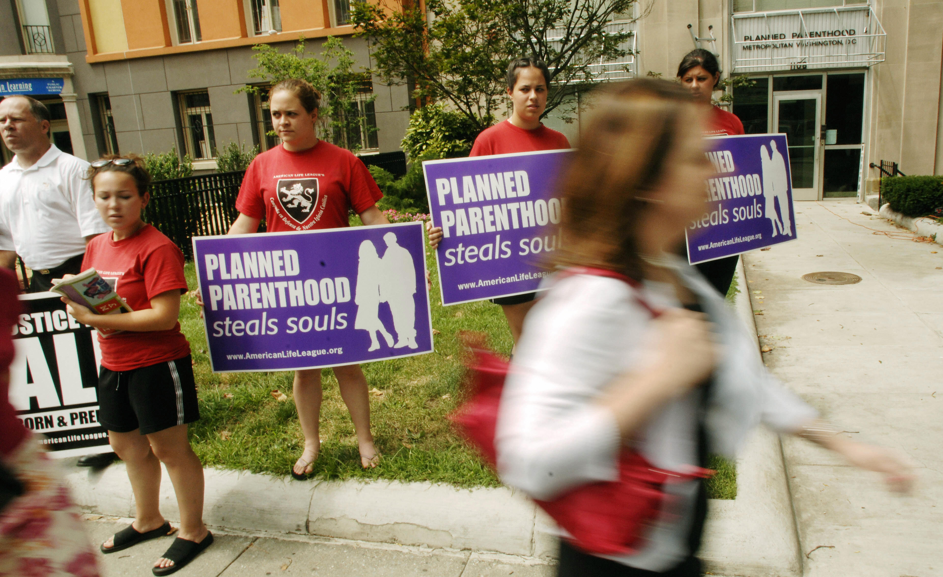 (Photo: Anti-abortion activists protest outside of a Planned Parenthood health clinic in Washington, DC on July 28, 2005. The group had walked from Maine to protest at pro-choice health clinics along the way. By Mandel Ngan/AFP/Getty Images)