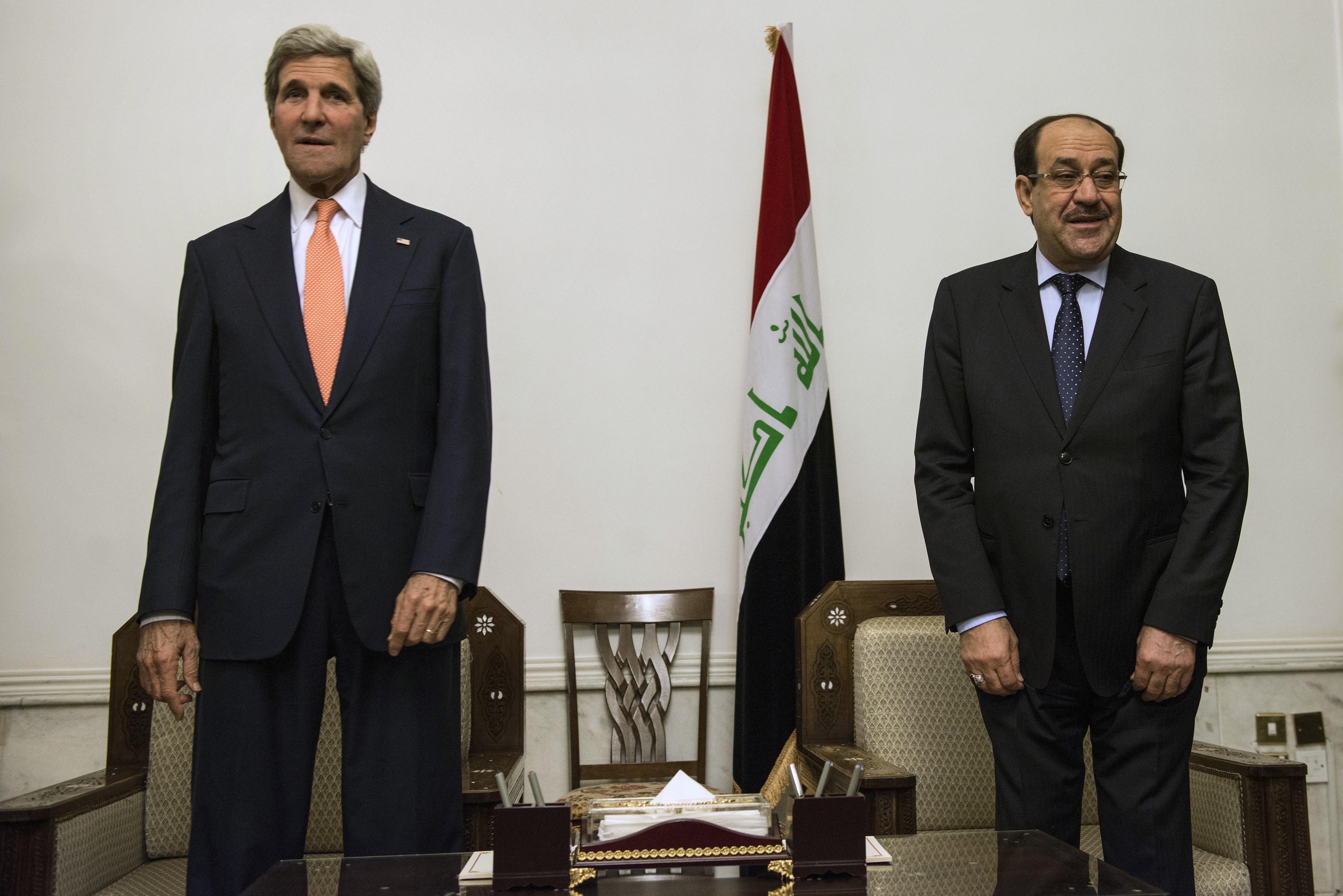 (Photo: Iraqi Prime Minister Nuri al-Maliki and US Secretary of State John Kerry meet at the Prime Minister’s Office in Baghdad on June 23, 2014. Kerry was in Baghdad to push for Iraqi unity and stability, as Sunni militants swept through western towns abandoned by the security forces. By Brendan Smialowski/AFP/Getty Images.)