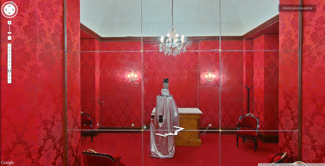 The Camera in the Mirror is a project by Spanish artist Mario Santamaría that showcases moments when the indoor Google Street View camera accidentally catches itself in a mirror. The device itself appears to be a podium-sized metal case on wheels with a camera on top and a laptop on the side. In some of the photos, you can see a human operator. The images specifically come from Google’s Art Project, a pretty awesome three-year-old effort to create visual maps of museum interiors.