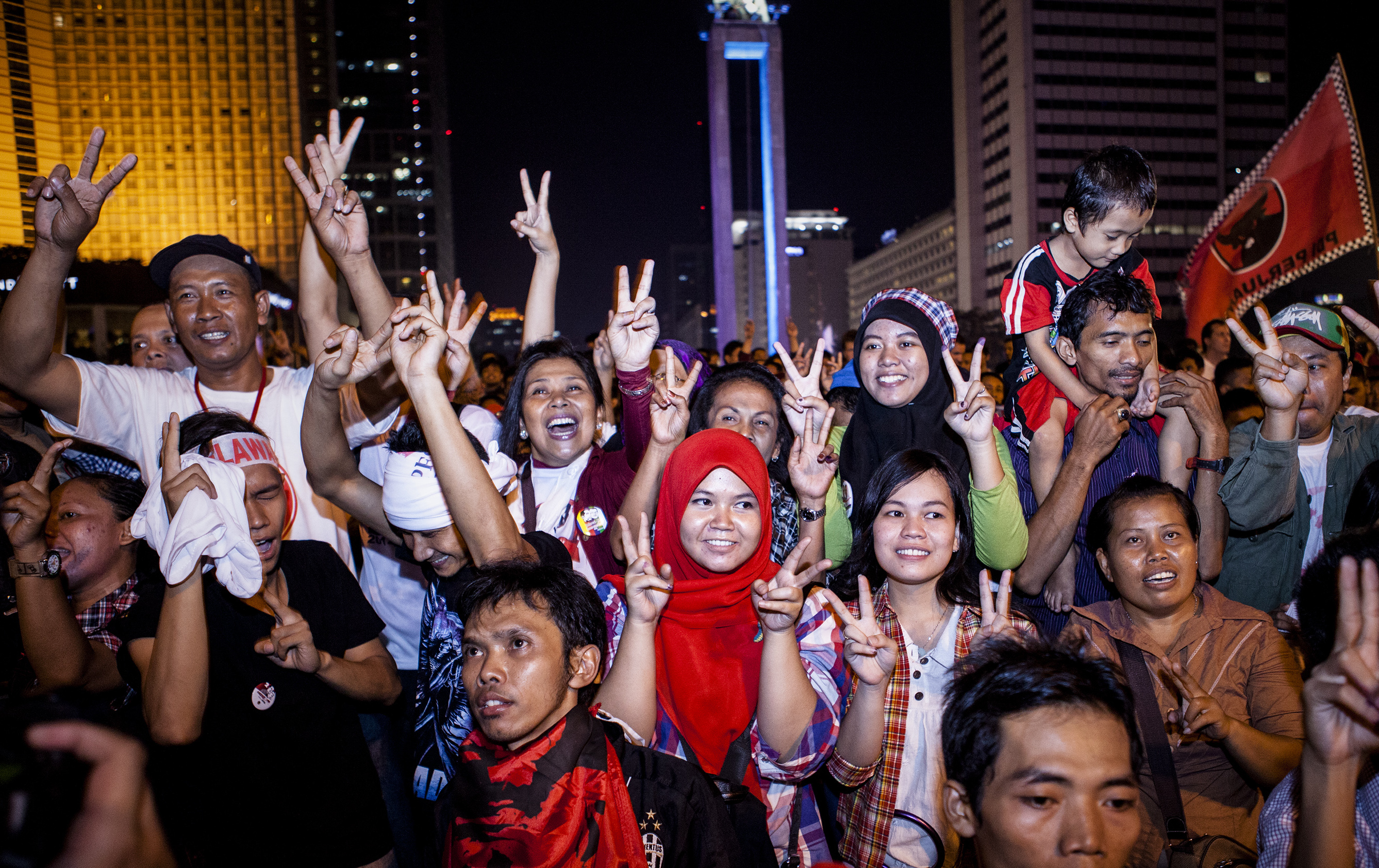 (Photo: Supporters of Indonesian presidential candidate Joko Widodo declare victory, although the vote counting is not complete, the race is very close, and the other candidate, Prabowo Subianto, has also claimed victory in the race on July 9, 2014 in Jakarta, Indonesia. By Oscar Siagian/Getty Images)