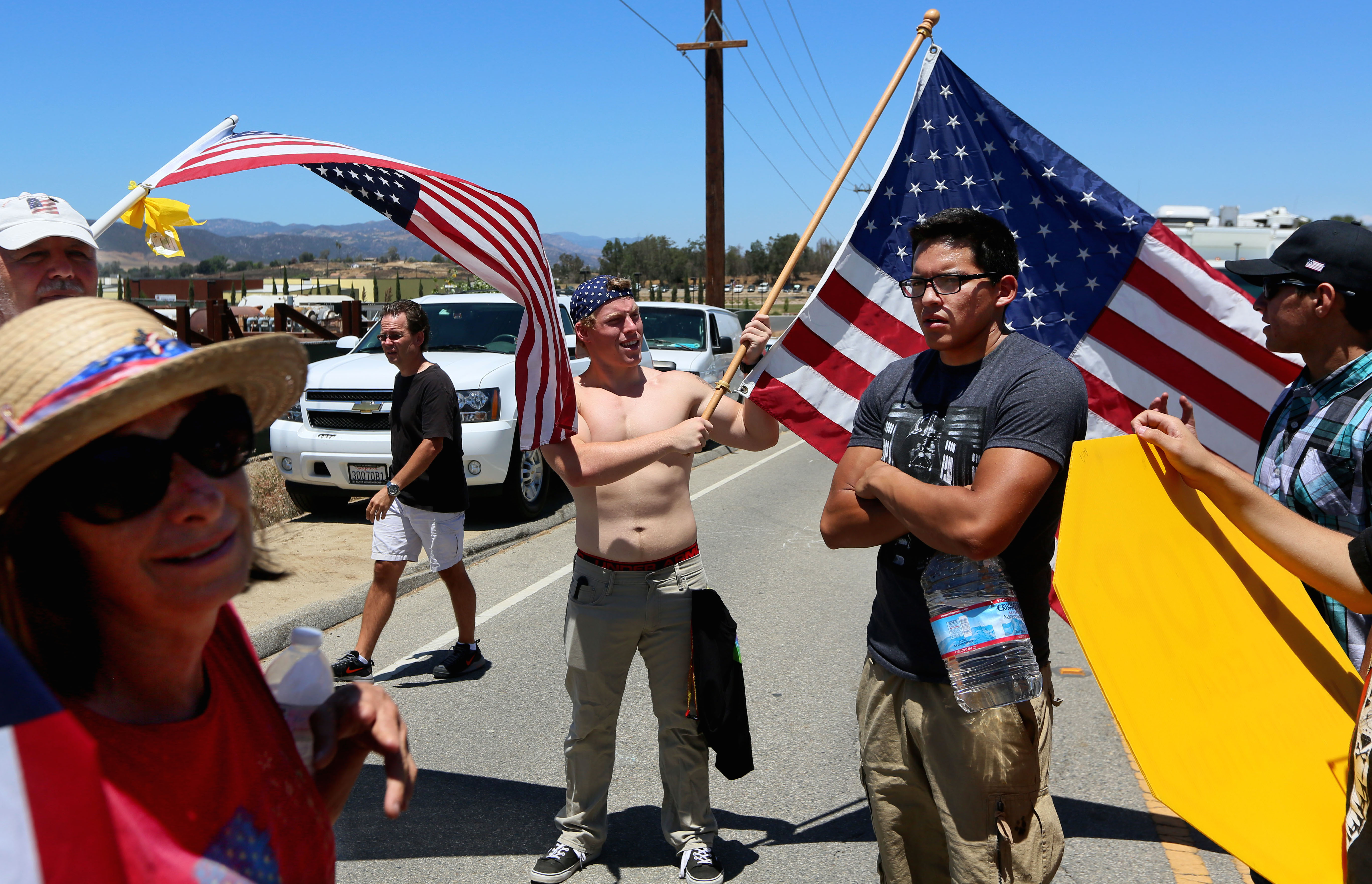 (Photo: Miguel Hernandez (R), an immigrant rights activist, stands among anti-immigration activists outside of the U.S. Border Patrol Murrieta Station on July 7, 2014 in Murrieta, California. Immigration protesters have staged rallies in front of the station for about a week in response to a wave of undocumented immigrant children caught along the U.S.-Mexico border in Texas and transported to the Murrieta facility while awaiting deportation proceedings. By Sandy Huffaker/Getty Images)