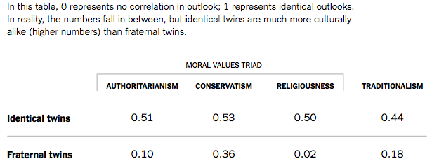 This somewhat acts as a confirmation of Jonathan Haidt’s notions of the values that predominate in conservatives and liberals. And here’s the data from sets of fraternal and biological twins: