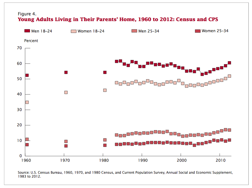Almost half of young people “living with their parents” are in college, where all campus housing counts as “living with their parents.” Scary Millennials Trends are fun and popular—young people read them to feel outraged; parents read them to gauge their own Millennial’s progress; others read them for schadenfreude. If we’re going to freak out about young people, let’s do so for the right reasons. Unemployment is too high, entry-level jobs are depressingly salaried, and many have taken on student loans that will negatively shape their immediate future.