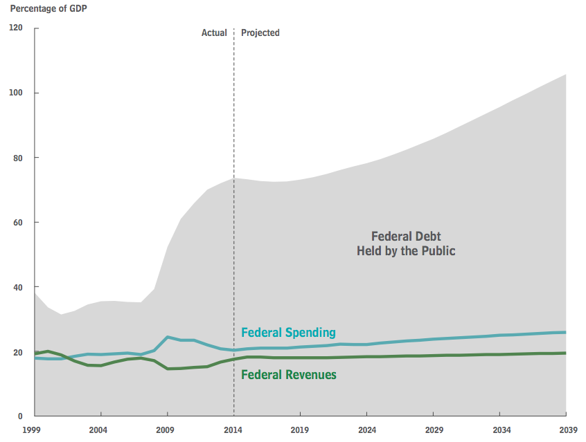 Under current law according to the CBO, debt will rise from 74 percent of GDP in 2014 to 80 percent of GDP by 2025, 108 percent by 2040, 147 percent by 2060, and 212 percent by 2085. These almost apocalyptic projections don’t even fully account for the scale of our predicament, as current law is held down by budgeting distortions, some benign and some gimmicky, like tax breaks that are projected to expire even though they’ll more than likely be extended and unrealistic cuts in Medicare reimbursement rates. As soon as 2039, the CBO anticipates a deficit of 6.4 percent of GDP.