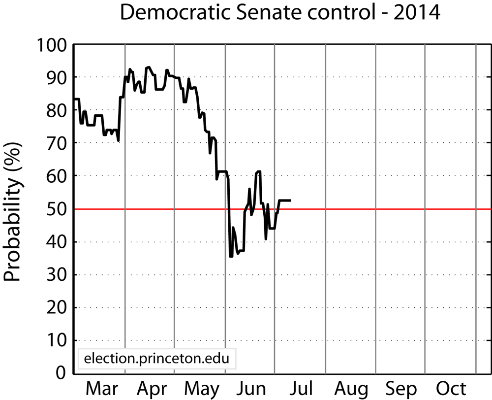 The graph shows a history, over time, of the probability of Democrats/Independents getting 50 or more votes in an election based on today’s opinion polls. On Election Eve, opinion polls closely track final outcomes. Therefore, consider this a snapshot of Campaign 2014.