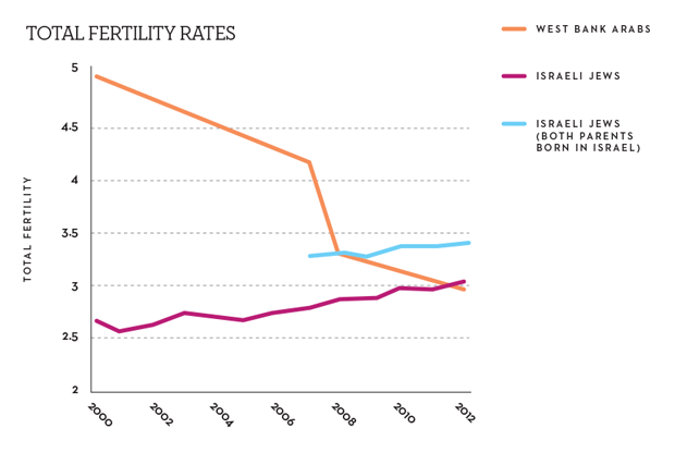 Israel is the great exception to the decline in fertility from North Africa to Iran, as I argued in a 2011 essay for Tablet magazine. The evidence is now overwhelming that a Jewish majority between the Jordan River and the sea is baked in the cake. The CIA World Factbook estimates total fertility of Arabs in Judea, Samaria, and Gaza at just 2.83 in 2014, versus 3.05 in 2011. The total fertility of Israeli Jews, meanwhile, has risen above three children per female … Jewish immigration is consistently positive and accelerating, while Palestinian emigration, at an estimated 10,000 per year since 1967, is reducing the total Arab population west of the Jordan River.