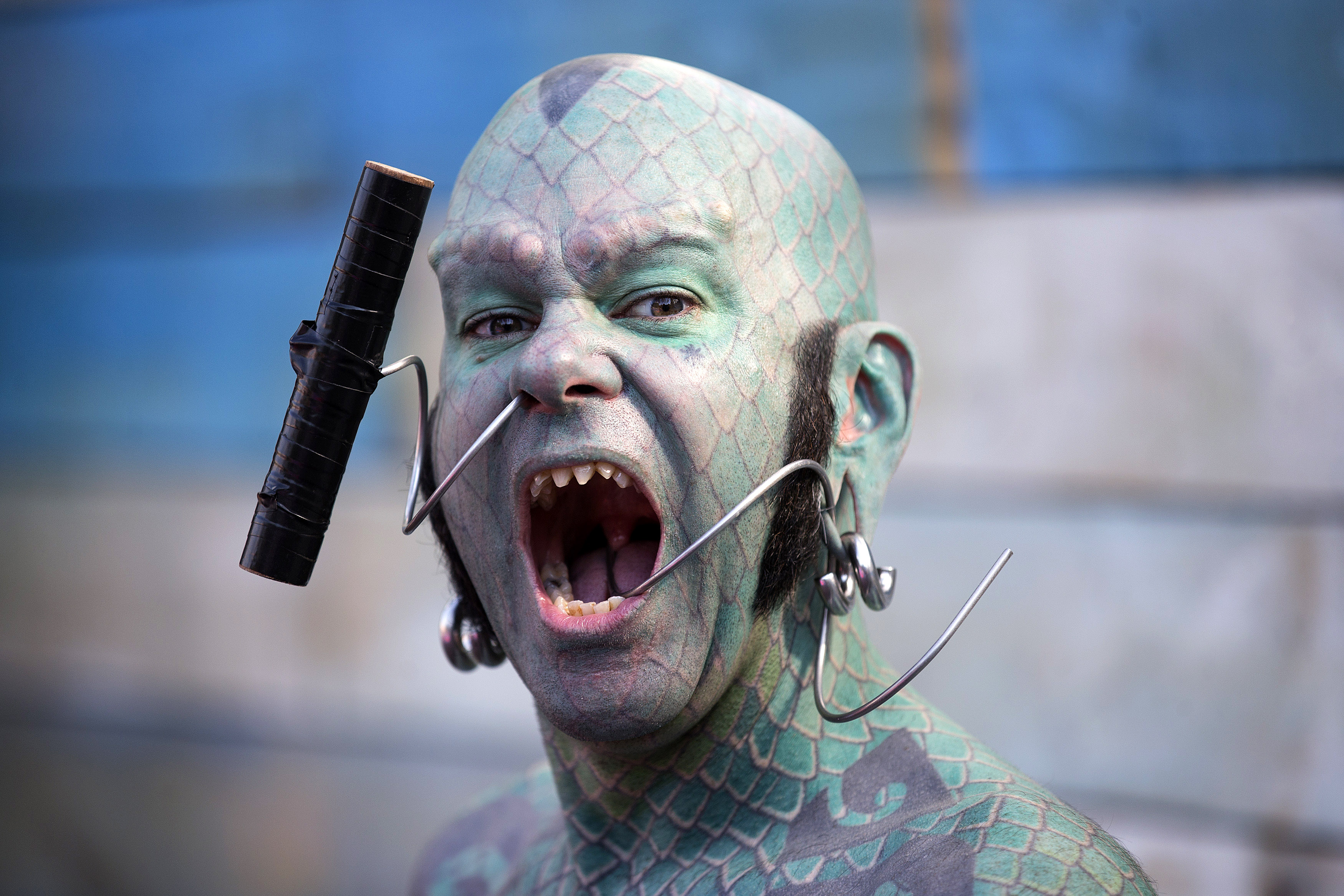 Fire-breather and sword-swallower ‘The Lizard Man’ poses for a photograph in the ‘London Wonderground’ at the Southbank Centre on July 24, 2014 in London, England. The temporary ‘London Wonderground’ venue, located adjacent to the London Eye and the Royal Festival Hall, offers a program of live entertainment, fairground rides and outdoor bars and runs until September 28, 2014. By Oli Scarff/Getty Images.