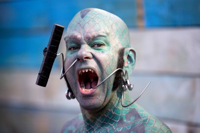 LONDON, ENGLAND – JULY 24: Fire-breather and sword-swallower ‘The Lizard Man’ poses for a photograph in the ‘London Wonderground’ at the Southbank Centre on July 24, 2014 in London, England. The temporary ‘London Wonderground’ venue, located adjacent to the London Eye and the Royal Festival Hall, offers a programme of live entertainment, fairground rides and outdoor bars and runs until September 28, 2014. (Photo by Oli Scarff/Getty Images)