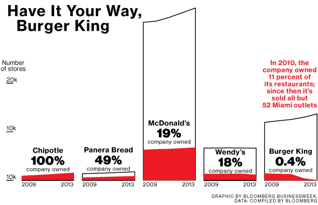McDonald’s owned 19 percent of its 35,429 restaurants worldwide in 2013. Wendy’s owned 18 percent of its 6,557 outlets. Historically, Burger King operated much the same way: When 3G bought the chain in 2010 it owned 11 percent of its 12,174 restaurants around the world. Since then, Burger King has sold all but 52; it keeps the last few for training executives and testing products.