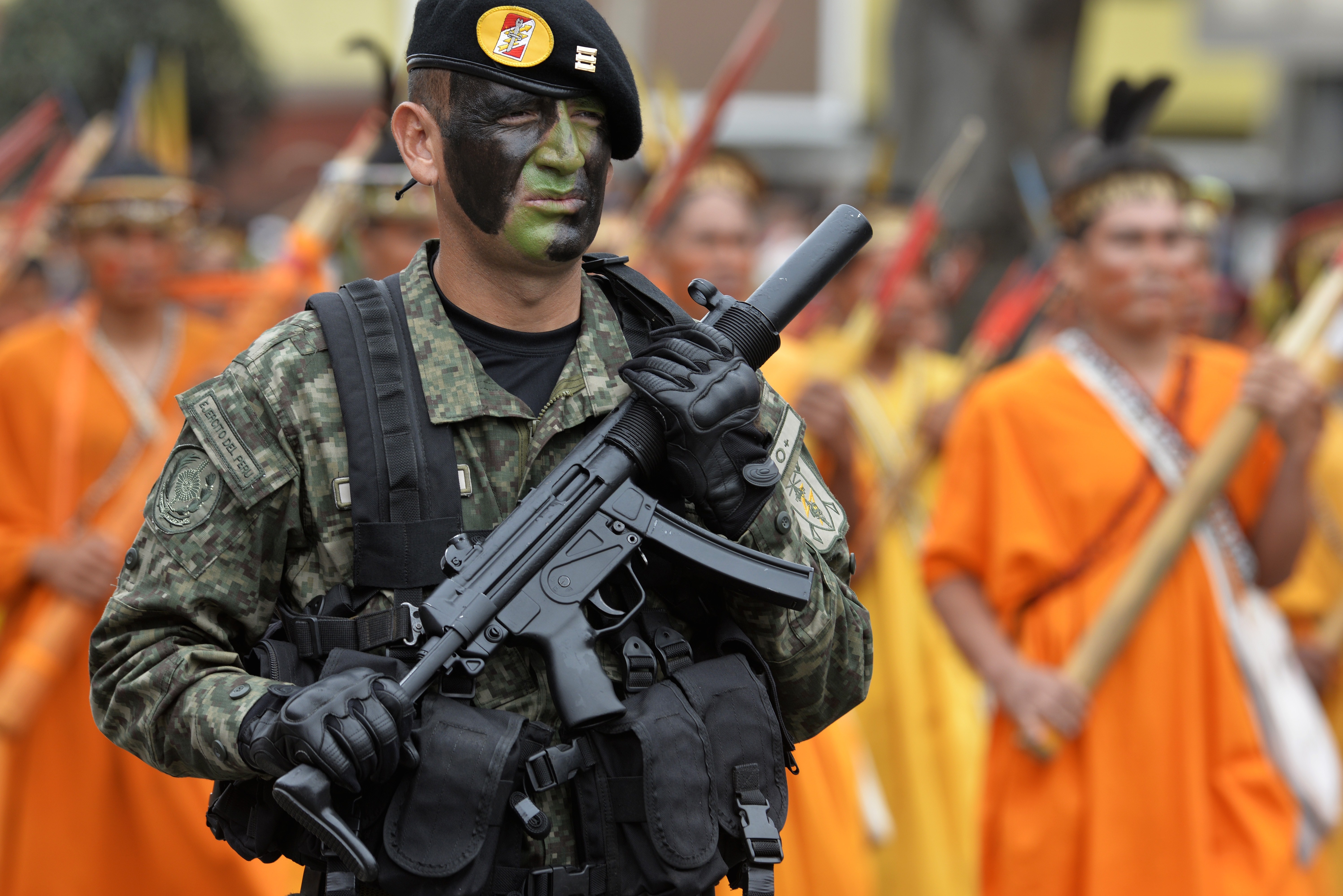 A special forces soldier precedes a group of members of different Amazonian ethnic groups participating in the traditional military parade commemorating the 193rd anniversary of Peru’s independence in Lima on July 29, 2o14. By Cris Bouroncle/AFP/Getty Images.