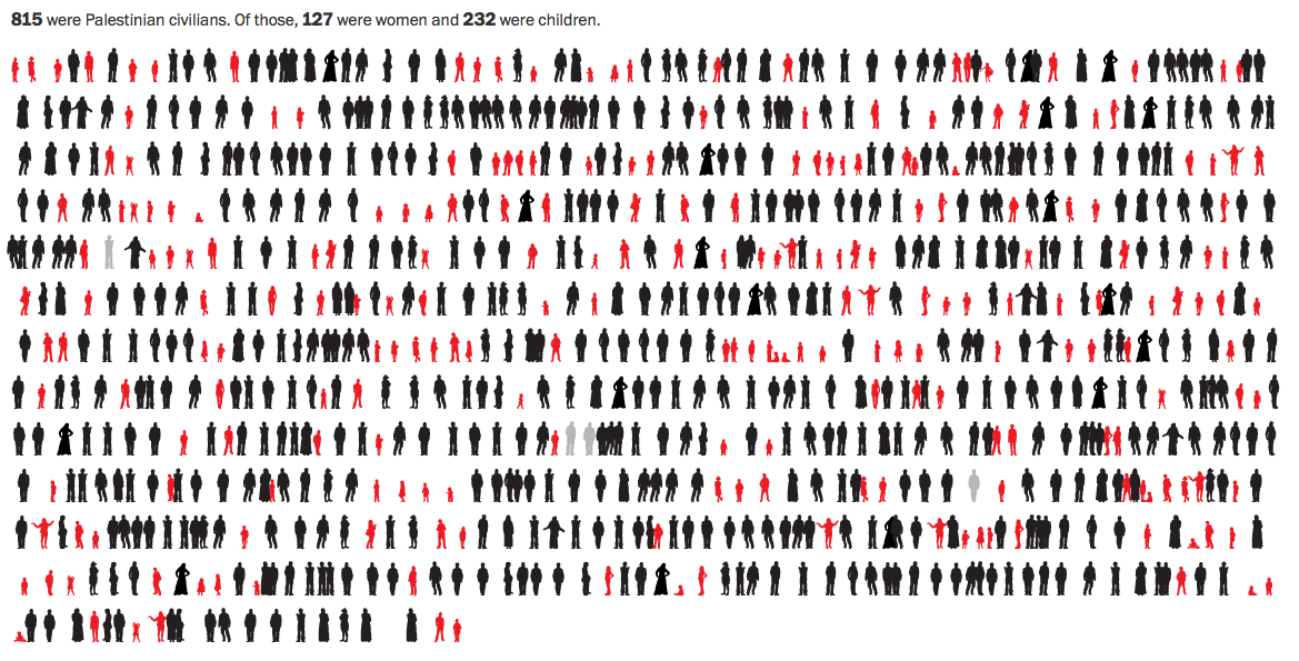 Above is an info-graphic from the Washington Post that visualizes the 815 civilian dead in Gaza (it’s updated day by day). The small red figures are children. 232 children have now died under the Israeli assault on Gaza, which originated in the outrage at the murder of three Israeli teens. I cede my time to Roger Cohen: