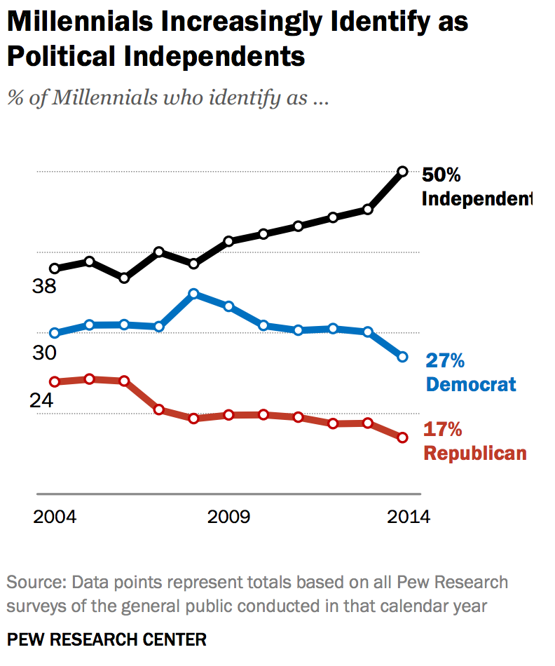 More than ever before, young people are defining themselves as politically independent, according to Pew Research Center and just about everyone else who polls them. But millennials identify as Democrats in similar proportions to older generations; it’s the GOP that’s bleeding young voters into the independent ether.