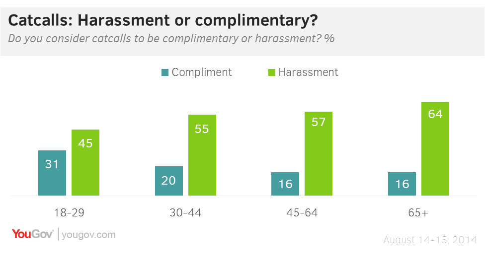 [A]ccording to a large majority of the public, it is never appropriate (72%) to catcall. 18% say that it’s sometimes appropriate, while 2% think that it’s always appropriate. Men (22%) were only marginally more likely than women (18%) to say that it is ‘sometimes’ or ‘always’ appropriate. Asked whether catcalls are compliments or not, most Americans (55%) say that they [constitute] harassment, 24% aren’t sure while only 20% think that they are ‘compliments’.