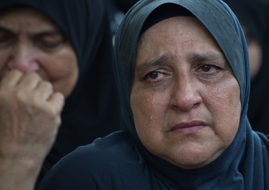 Noriah Daud (R) the mother of late co-pilot Ahmad Hakimi Hanapi, who perished aboard flight MH17 downed in eastern Ukraine, attends a burial ceremony in Putrajaya, outside Kuala Lumpur on August 22, 2014. Black-clad Malaysians paused for a minute of silence August 22 on a nationwide day of mourning held to sombrely welcome home the first remains of its 43 citizens killed in the MH17 disaster. AFP PHOTO / MOHD RASFAN (Photo credit should read MOHD RASFAN/AFP/Getty Images)