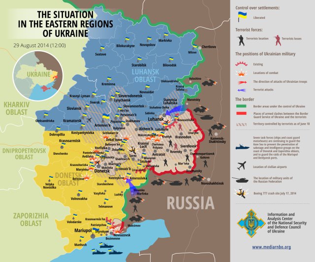 Overnight, Russian president Vladimir Putin issued an appeal to the separatist groups to create a “humanitarian corridor” in order to allow besieged Ukrainian troops to return “to their mothers, wives and children.” But in addressing the rebels as the “Novorossiya militia,” he employed a provocative Czarist era term that implies Russian ownership of a big chunk of modern-day Ukraine. A separatist leader said that his forces would grant safe passage for Ukrainian troops to flee the fighting, on the condition that they left all of their weapons behind.