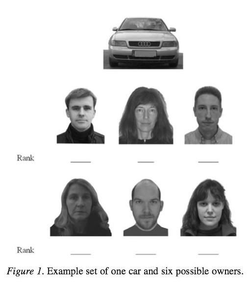 with their correct owners above chance levels. And that’s what they found. “The real owner was in fact assigned rank 1 most frequently,” they write, “and rank 6 least frequently.” This proved true regardless of the subjects’ sex and age. There were an equal number of male and female judges, and they ranged widely in age—from 16 to 78 years. In case the sheer bizarreness of these data hasn’t quite registered, let me put it to you more bluntly: The average person can detect a physical similarity in the “faces” of cars and their owners. …