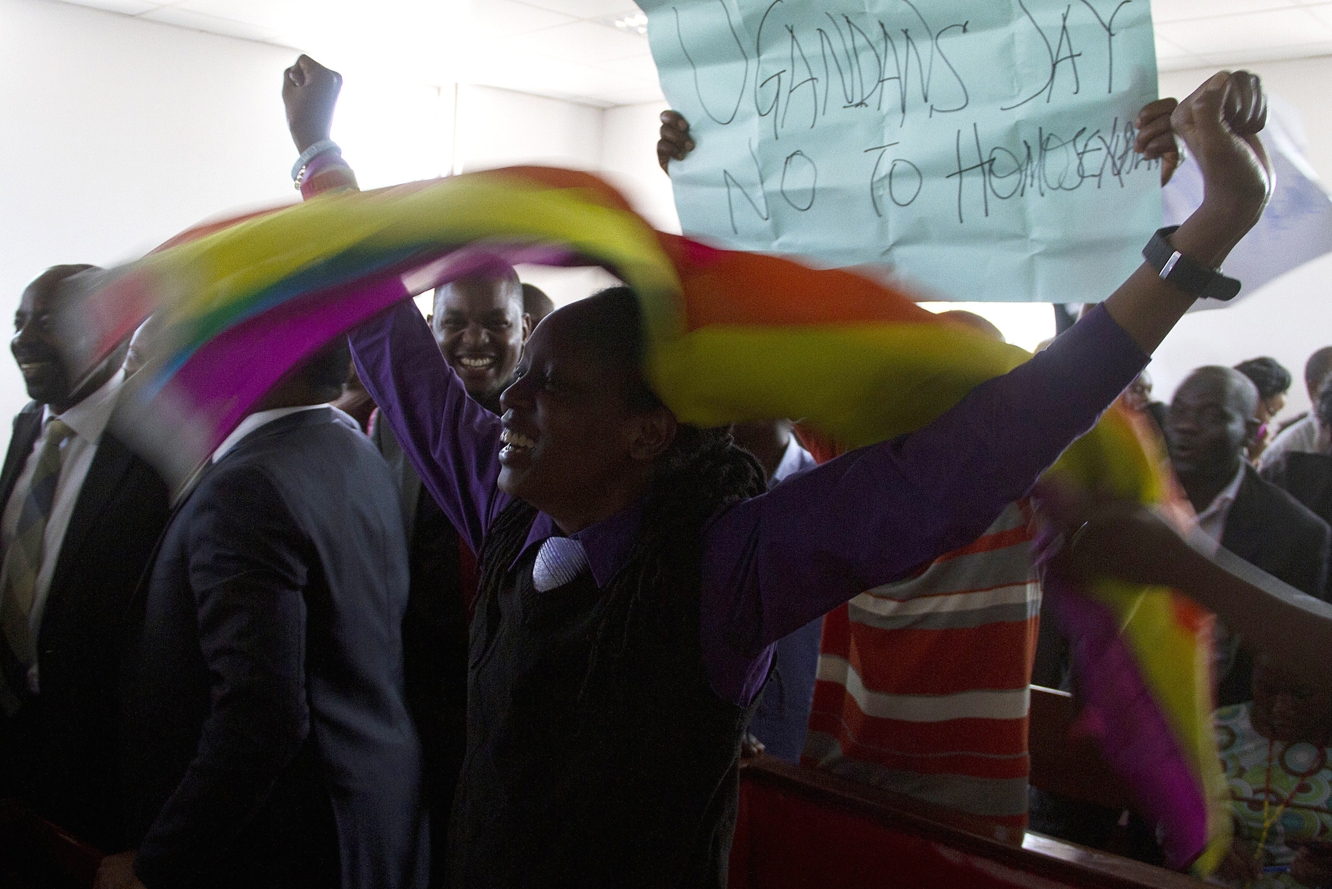(Photo: Ugandans react to the announcement that the Constitutional Court has overturned anti-gay laws in Kampala on August 1, 2014. By Isaac Kasamani/AFP/Getty Images)