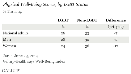 Differences in physical well-being between straight and queer men, for example, are too small to be statistically significant; the overall deficit in physical well-being for the LGBTQ community at large is driven entirely by the low scores of queer women (24 percent to straight women’s 36 percent). Gallup indicates that reportedly high levels of smoking and drinking among lesbians and bi women could be a potential contributor to the discrepancy. I’ve seen from accompanying girlfriends on many a smoke break outside of bars how cigarettes and alcohol remain an obstinate fixture of queer girl culture.