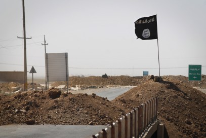 A flag of the Islamic State (IS) is seen on the other side of a bridge at the frontline of fighting between Kurdish Peshmerga fighters and Islamist militants in Rashad, on the road between Kirkuk and Tikrit, on September 11, 2014. Ten Arab states, including heavyweight Saudi Arabia, agreed today in Jeddah to rally behind Washington in the fight against Islamic State jihadists, as it seeks to build an international coalition. AFP PHOTO/JM LOPEZ (Photo credit should read JM LOPEZ/AFP/Getty Images)
