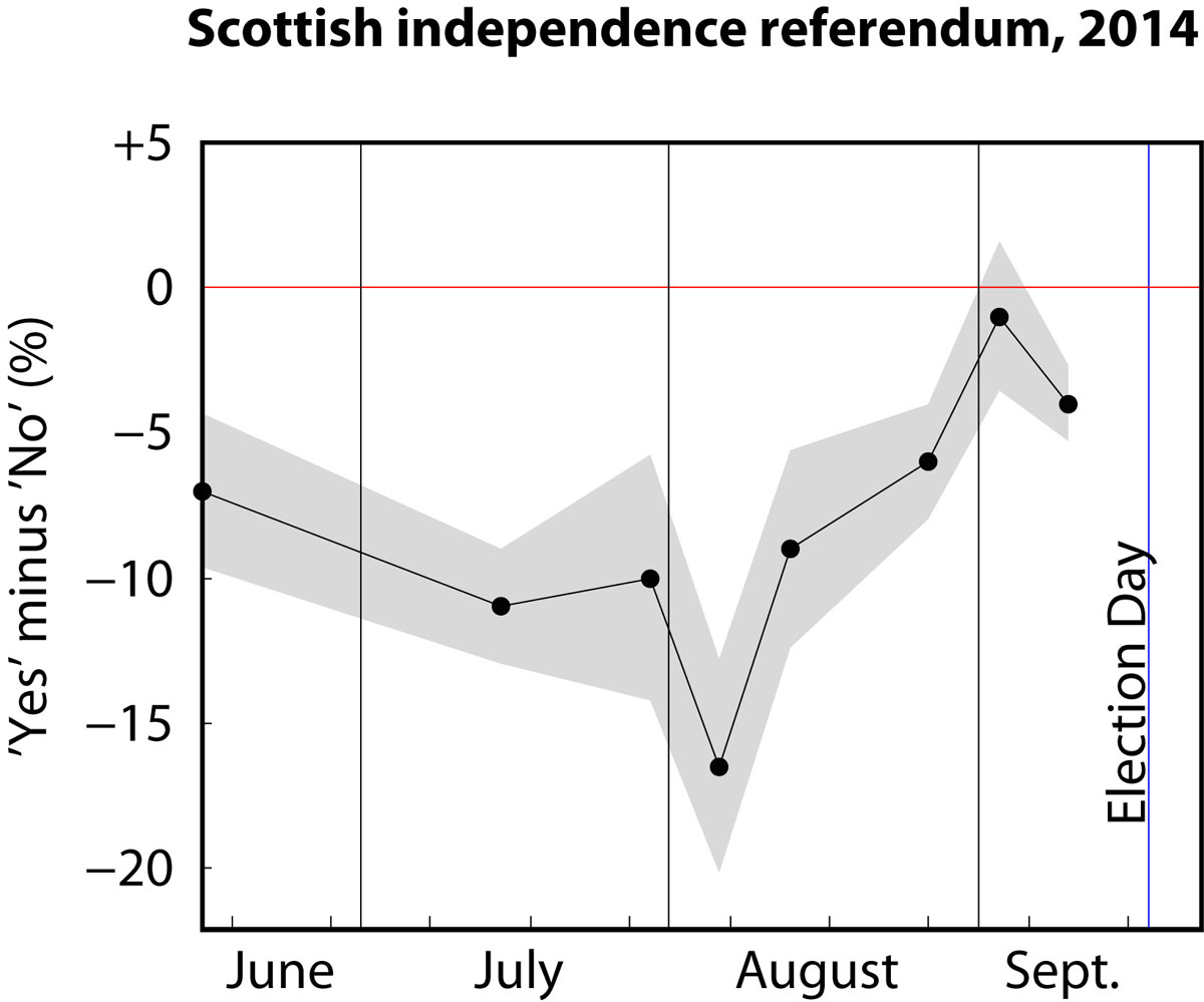 Thursday’s election will be extremely close, thanks to the elusive quality of political momentum. Shown above are the results of opinion surveys conducted in Scotland on this question. Each data point shows the median of 2 to 6 surveys, and the gray zone indicates the 1-sigma confidence band. The word “momentum” gets thrown around loosely in politics. To get back to its meaning in physics, one definition might be a change in opinion that looks like it will continue in the same direction. In that sense, “yes” has had the momentum.