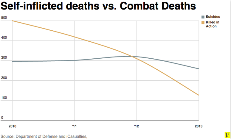Last year alone, 475 active service members took their own lives according to a report published last week by the Department of Defense. In the same year, 127 soldiers lost their lives in the line of duty reported icasualties.org — a website that has been documenting war deaths since the Iraq War in 2003. That’s the lowest level since 2008.