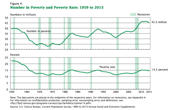 The official poverty rate declined from 15 percent in 2012 to 14.5 percent in 2013, although the number of Americans living in poverty remained statistically unchanged for the third year in a row. That’s largely because of population growth. Poverty is now starting to tick down as unemployment declines, and as more workers, who held at best part-time jobs in 2012, find full-time employment. Between 2012 and 2013, Census counted 2.8 million net new full-time workers in the United States, with many of those jobs marginally improving the prospects of families that had been living below the poverty line.
